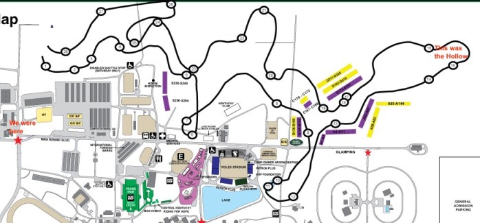 Thankfully, one of the golf cart drivers took pity on the three of us. He drove the two girls to the paddocks to watch the TB presentation and he took me a ways further before I started my trek to the Hollow. I got there just in time to place my towel and sit my ass down for some much needed leg rest. Got my camera out, my food, and then we all proceeded to be quite confused when it was 9:35/9:40 and no horses had shown up yet. A few of us, myself included, grabbed the live stream and loaded it on our phones so we could watch the combinations as they came to the Hollow and then proceed to take pictures.