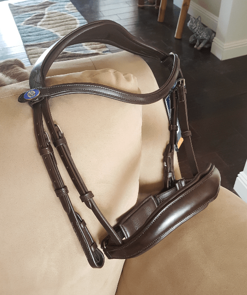 Honestly, I’ve tried to think of something that I don’t like, and I can’t. It is a beautifully crafted, innovative bridle, even down to the u-shape of the browband. It required virtually no break-in time, and it feels like sturdy, well-tanned leather. I’m already wondering if somewhere in the future I can need a new one. I just might have an addiction…..