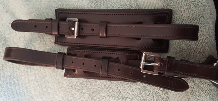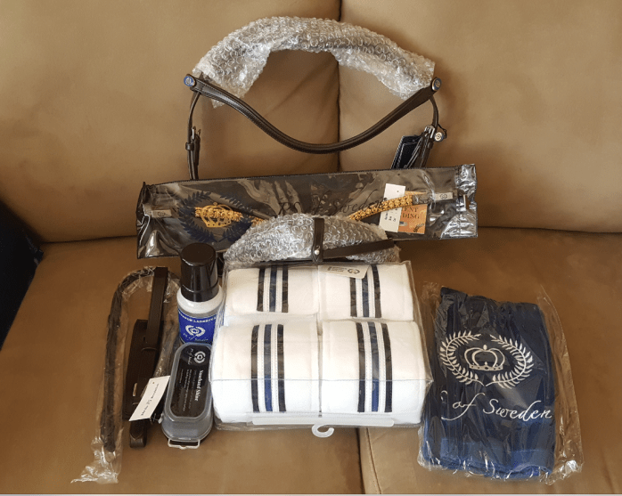 They were very kind and threw in two extras that you see there – a noseband shining sponge and an embroidered towel. This was even AFTER I had messed up my order and forgotten to add the throatlatch! 110% customer service right there.