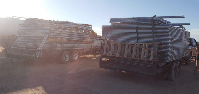 The guys with High Desert Barns finally arrived! Last night they pulled in two large trucks full of panels for our new barn. We went over the “plan” with them on the pad for a few minutes before they headed out. They’ve already started measuring this morning – bright and early at 6 am!
