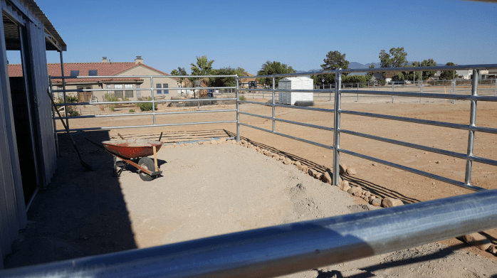 We also had the grader put some of the arena sand in the runs since our ponies love sleeping outside and the pad was hard packed. So we worked on smoothing it out. Hello softness!