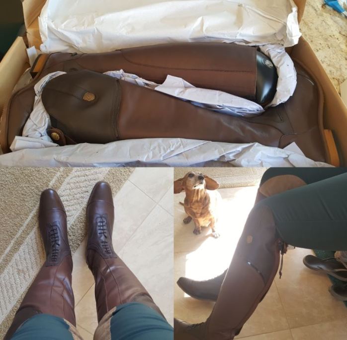 It could be the fact that I’ve never owned a GOOD pair of tall boots. But whatever it is, I adore these tall boots. I love the way they look – especially the two-tone. I think that’s fantastic. I love that they’re actually MADE to be leg conforming (which, yes I know is not all that uncommon these days) and that I have had little to no break-in time whatsoever. They were gorgeous out of the box, even more gorgeous on, and I wore them for probably an hour before deciding I’d show in them the whole morning the next day. And you know what? Only towards the end of the show day, after wearing them for about 5 hours as a first wear, did the boot start to hurt the back of my right ankle (and I wasn’t surprised – for some reason in every shoe that goes above the ankle my right one needs extra breaking in). I unfortunately didn’t get the chance to wear them to the October show, but I’ve ridden in them a few more times to continue breaking them in, and so far, every time I put them back on they feel better. I’m expecting them to fall a little more – I think they’ve maybe fallen 1/4″ already, and for someone that doesn’t like uber tall boots, even if they don’t fall more than that it will be fine because the back of the boot doesn’t bother me.