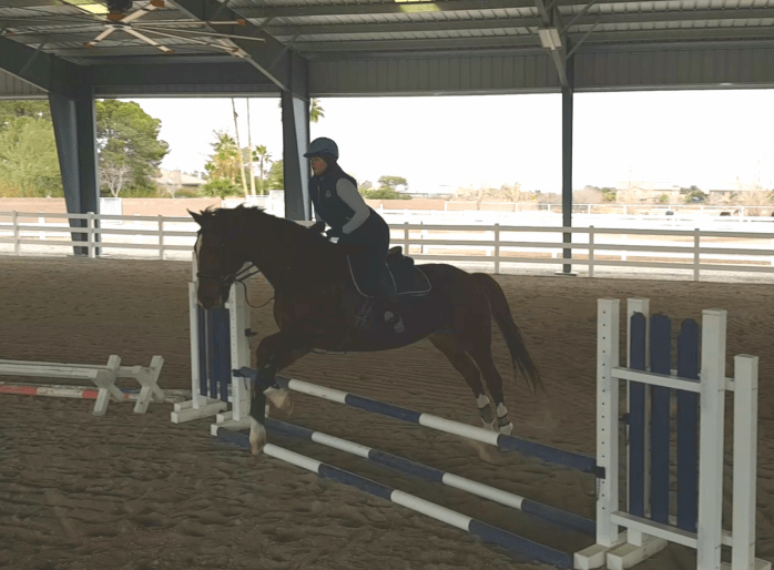 We had 2 runs of trot to crossrail and canter to vertical, and both times felt positive. Soxie is positively the easiest horse I’ve ever ridden to trot a jump haha. I know she’s going to go, and you can feel her excitement of YAS JOMPIES and she does this ever-so-polite canter stride before the jump that you can just let yourself relax and follow her momentum over the jump. So it really allows me to think about my weight in my heels, closing my leg around her and keeping my elbows straight and forward without worrying if she’ll jump or not. We reiterated her coming down to a trot for a simple lead change as well as just reminding her to come back, and then turned off the rail to the small vertical. I turned a little early, and was just a little too soft. She lengthened as she locked onto the jump, but was super responsive when I half halted and steadied her a little, so we came up short to the vertical. It still felt like a good ride – I was a thinking rider, I was helping her out, I was actually able to rate her stride to judge the distance, and instead of being indecisive, I made the decision to be short to the jump.