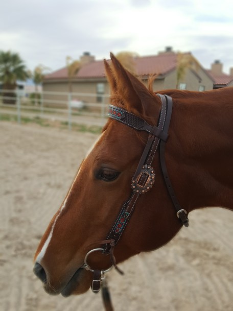 Even her western saddle is a little big on her right now with all her muscle loss, so I “needed” a breastcollar that would help the saddle stay forward. I went back and forth on A LOT of breastcollars, worried that they were all actually too small (I wasn’t wrong). So I found the longest one, and coincidentally it had a matching bridle, AND the design matched the collar I bought Choco about a month or so ago, so I mean it’s meant to be, right? So, it came home with me.