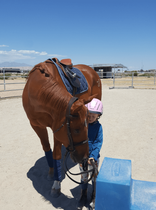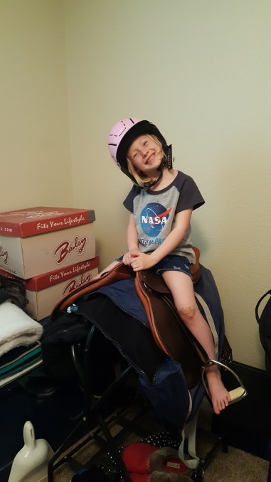 My mom has a beautiful Pre de Nations saddle that she’s kept forever in her trunk, and it’s been labeled as the kid’s saddle for whenever kids (more specifically grandkids) were to ride. Well, Kaylee immediately wanted to see the saddle, and try on her kid’s helmet that I bought her as I assembled the kid’s stirrups onto the saddle. So then obviously, we had to ride.