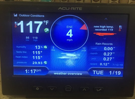 Tuesday it reached 119, with some clouds coming in and upping the humidity to 17% while still being 117 as I was doing chores for the evening. I seriously wonder if this is how chickens or turkeys feel when we put them in the oven. Either that or I’m just melting. It’s just gross. Wednesday was 118, Thursday was 114, and it’s generally still 100 degrees when I go out for a barn check at 10 pm.