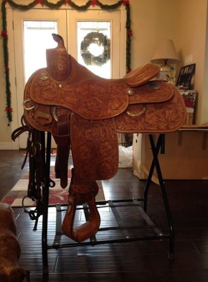 This is really just in case any of you know someone looking for a western saddle. It’s my mom’s but I figured it was worth a shot to put it up here. Saddle is California poppy tooling, semi-quarter horse bars (which is basically the Western equivalent of a medium to medium wide tree in English). It has a 15 1/2″ seat and is luxuriously padded – stirrups are padded as well to aid in foot comfort. Was used very lightly for a year. 3 bridles are added – all plain but good for showing. Bit is a twisted wire western D snaffle. Padded saddle cover included. $1000