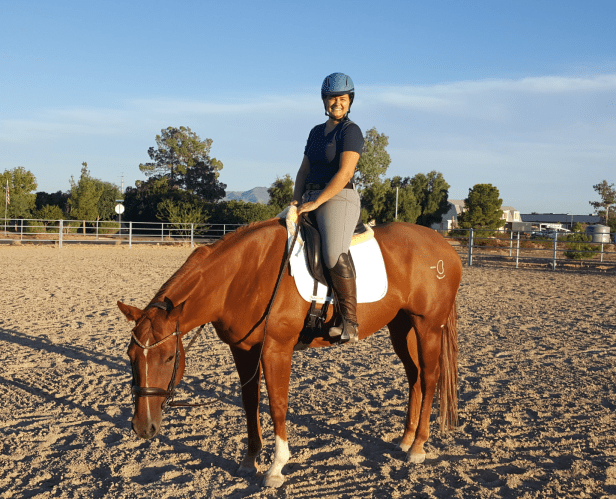Either way we were saddled and ready when Trainer G got to us. It was a beautiful day – maybe about 78 degrees with a cool breeze – absolutely perfect. I will freely admit I was a little chilled when I first went out to tack up lol. Going from the 100s to mid-90s to 70s in about a week has been like whiplash for everyone here in Vegas – hence also why I’m sick. (I have been properly astonished to see how hot it is for everyone east of me/on the east coast and it’s practically noon here as I’m writing this and freaking 72 degrees. I can’t even lol since writing this tho, thankfully the majority of you guys have cooled off a bit!)