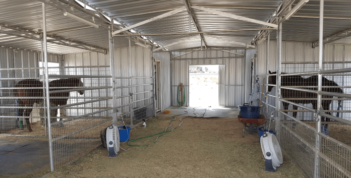 Second, sometimes I will sponge Amber off before a ride – especially if it’s nice and breezy since that will help her stay cooler. Otherwise I always hose her off afterwards and immediately have a fan on her. The water that runs to our barn is much hotter than the water that goes to the arena – we accidentally miscalculated how deep to dig the trench for the water pipes, so it’s shallower and the water is consequently much hotter. I’ll throw the hose on and let it run for as long as it’ll take me to untack, then hose Amber down. Even if the water is still hotter than I’d like, the fans help to cool off the water on her skin almost immediately (I also always put my hand against her to make sure it feels cool).
