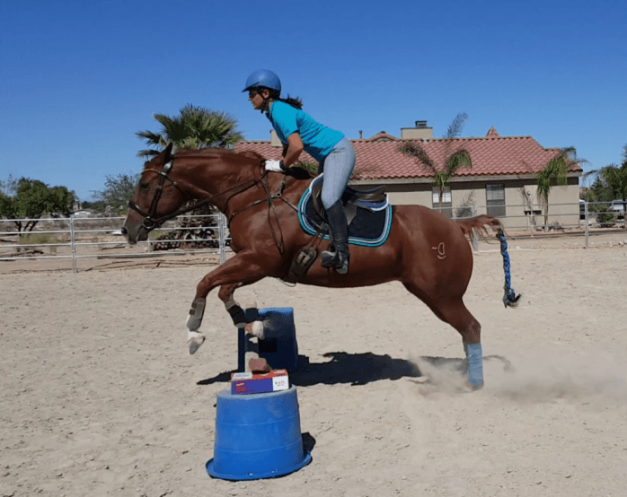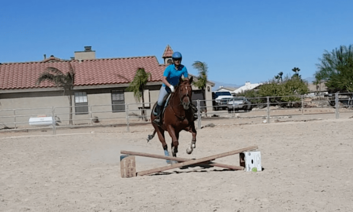 She’d gone over cavaletti at this height, so I was thinking she’d just trot over it…. Yeah, she surprised me. My mom and I had a good laugh though because she’s just so cute and you can see the wheels in her brain turning as she tries. And while I certainly need to continue getting stronger, this is better than the last time I popped over a crossrail to test out a saddle 6 months ago…. But here’s a closeup of her over-exaggeration.