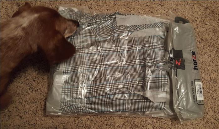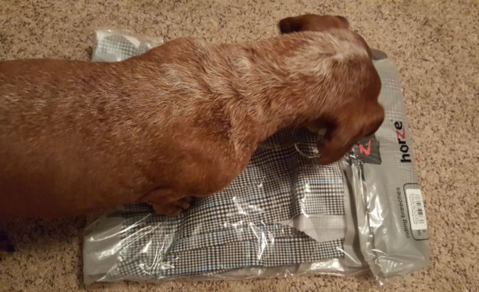 I also got some breeches in the mail finally. I’d ordered a super cute pair from Horze and wanted to try some full seat breeches. These came really well packaged, and of course, Choco had to check them to make sure there was nothing wrong with them.